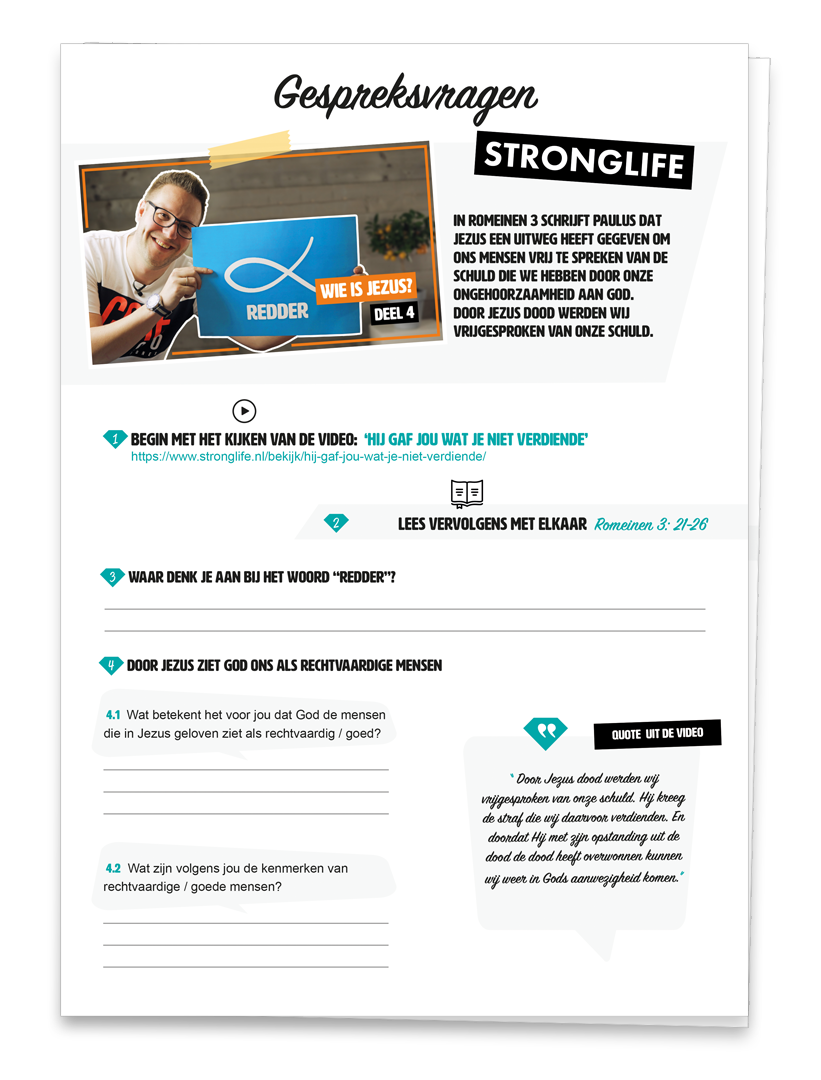 Bij deze video hebben we gespreksvragen ontwikkeld om bijvoorbeeld tijdens een jongerenavond met elkaar in gesprek te gaan. De opzet is heel simpel: je begint door samen naar de video te kijken, daarna lees je een Bijbelgedeelte en vervolgens ga je met elkaar in gesprek.